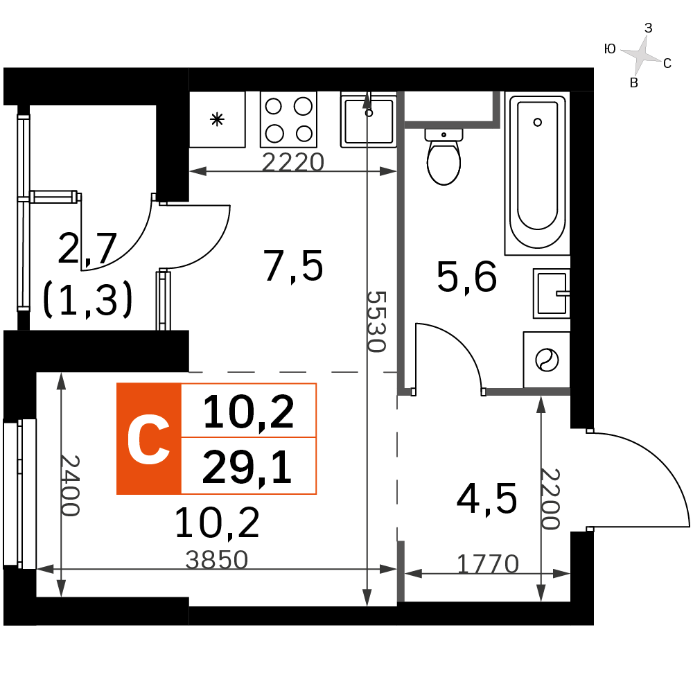 Продажа 1-комнатной квартиры № 7, 27 кв.м, этаж 22/43 в ЖК Скай Гарден (Sky Garden)