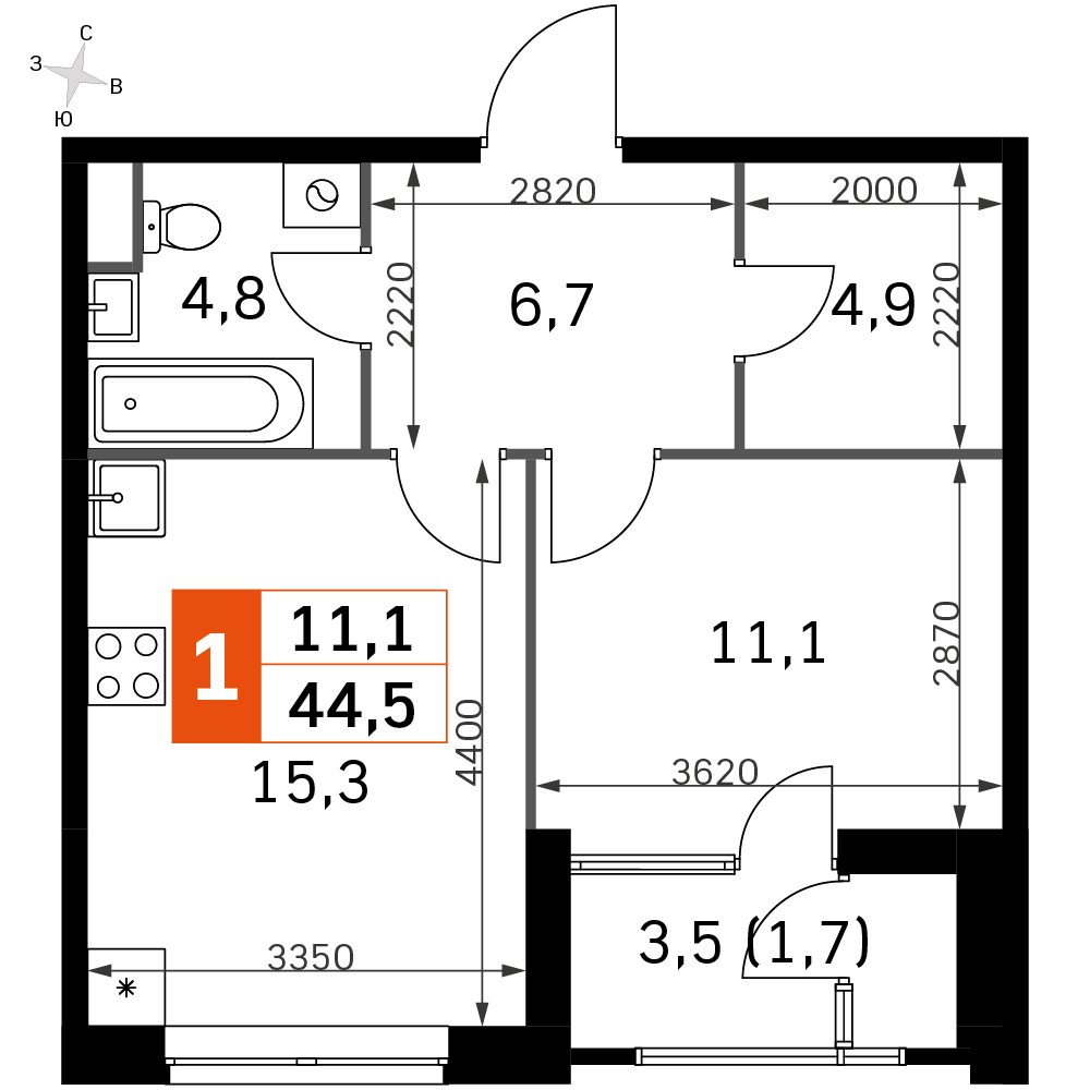 Стартовали скидки 15% на готовые квартиры с отделкой. Теперь купить однокомнатную квартиру 44 кв. м можно с выгодой до 1,7 млн рублей.
