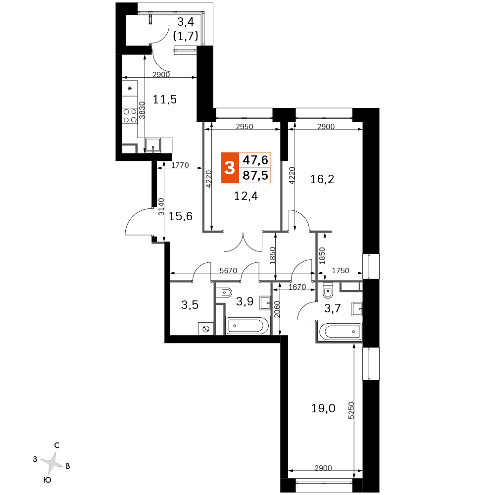 85.6 м² · 3 комнаты · 17/44 этаж · Март 2027