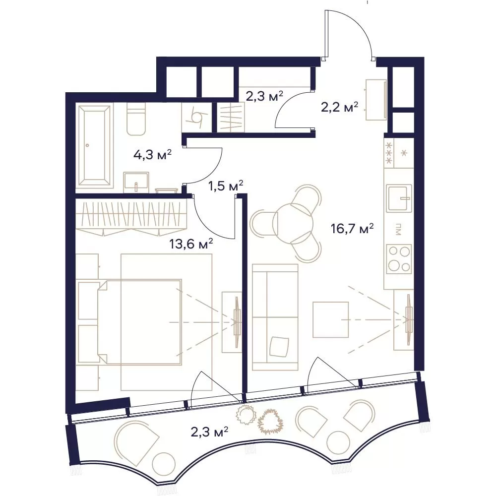 43 м² · 1 комната · 16/23 этаж · Объект сдан