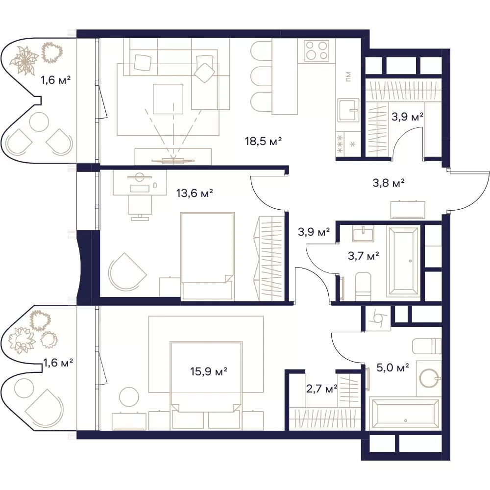 73.8 м² · 2 комнаты · 16/23 этаж · Декабрь 2024