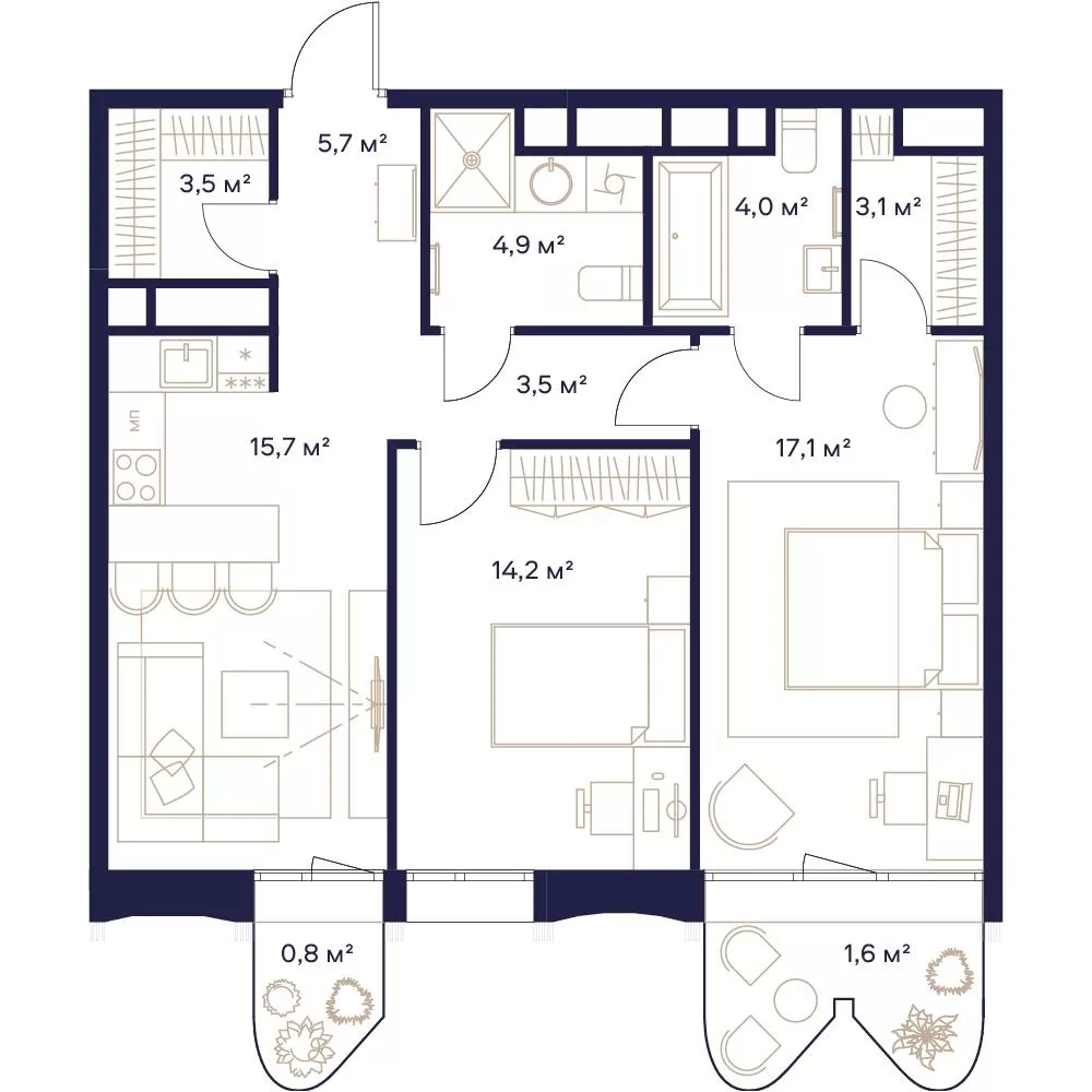 Продажа 2-комнатной квартиры № 4, 73.9 кв.м, этаж 15/23 в ЖК «СОЮЗ»