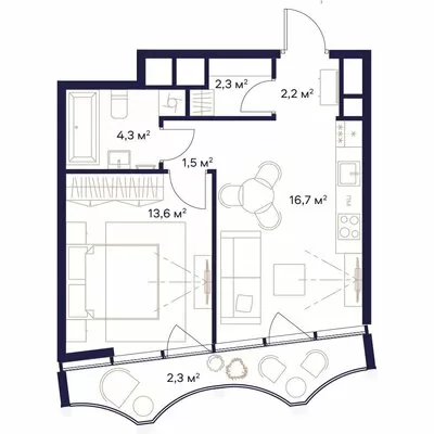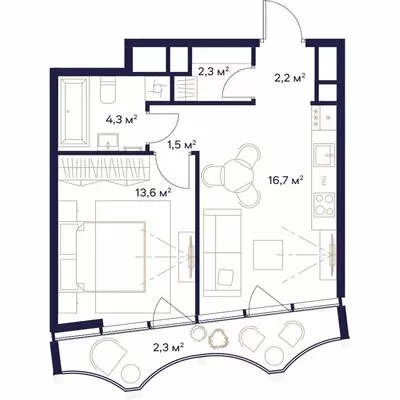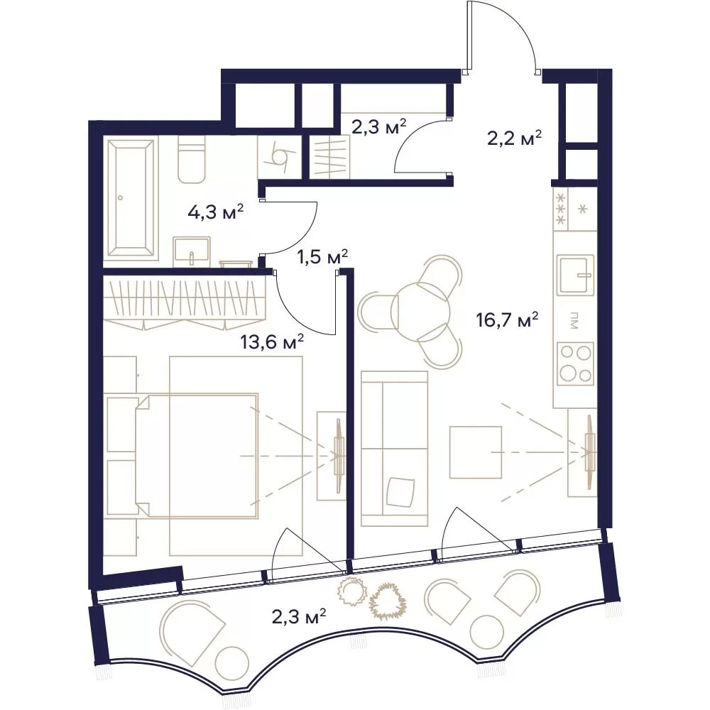 43 м² · 1 комната · 16/23 этаж · Сентябрь 2025