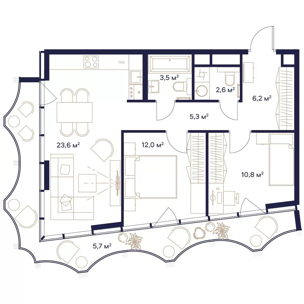 • Фасады золотистого цвета с волнообразными балконами, вдохновленными рекой Яузой