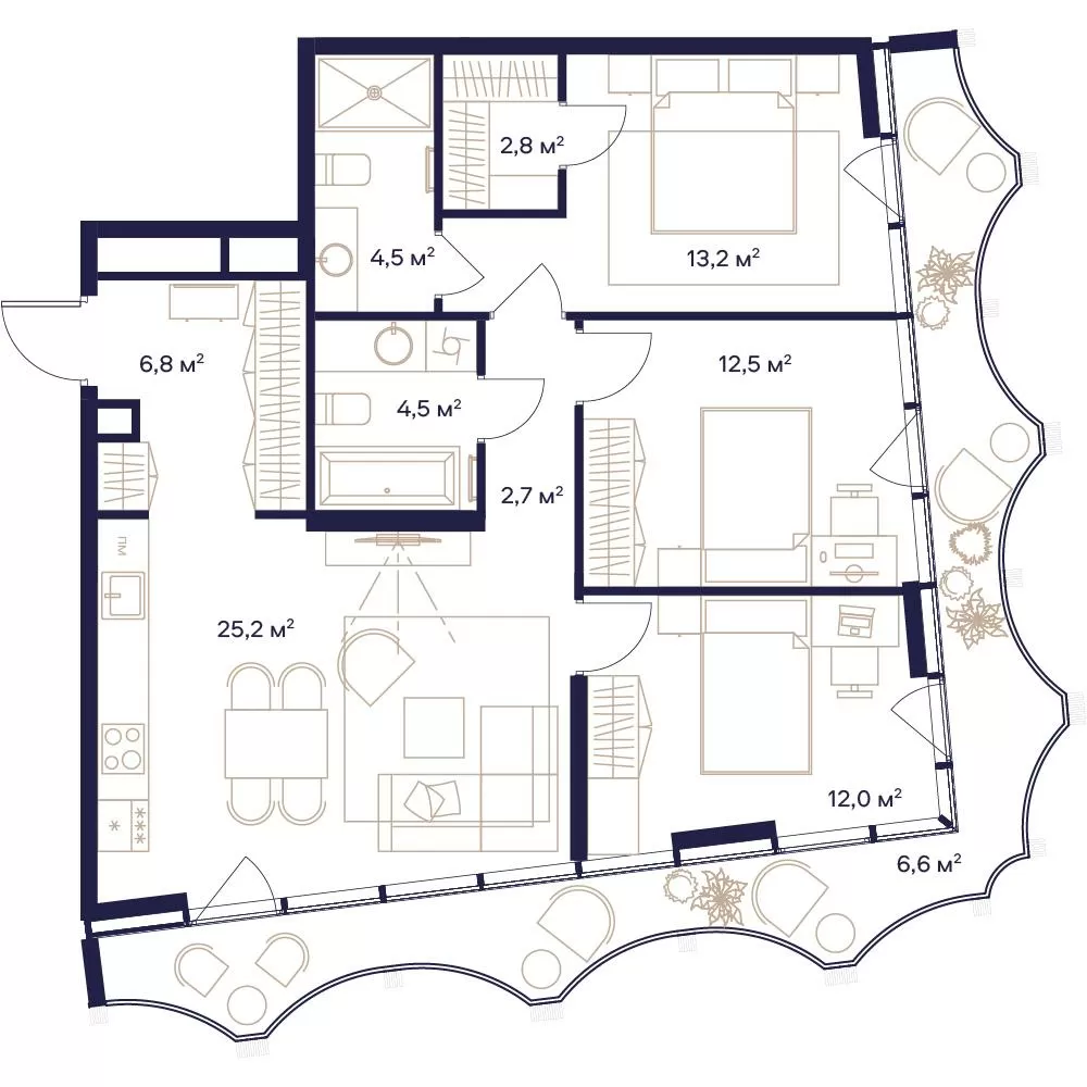 • 40+ эксклюзивных планировок: уникальные предложения: пентхаусы, квартиры с террасами (до 60 м²), мастер-спальни, окна в ванных
