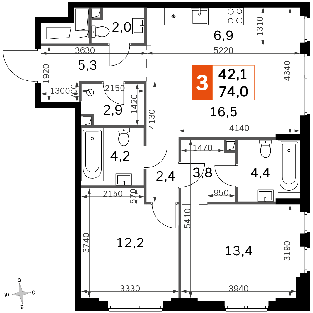 73.9 м² · 3 комнаты · 28/42 этаж · Сентябрь 2027