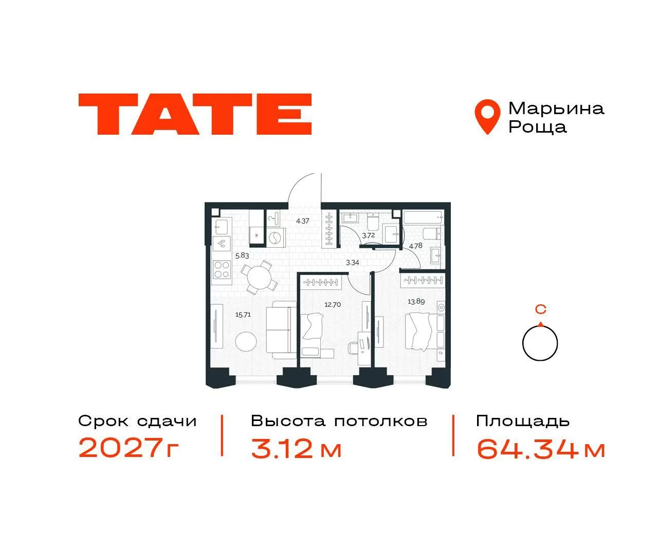 Продажа 2-комнатной квартиры № 10, 64.34 кв.м, этаж 18/49 в ЖК Тейт (TATE)