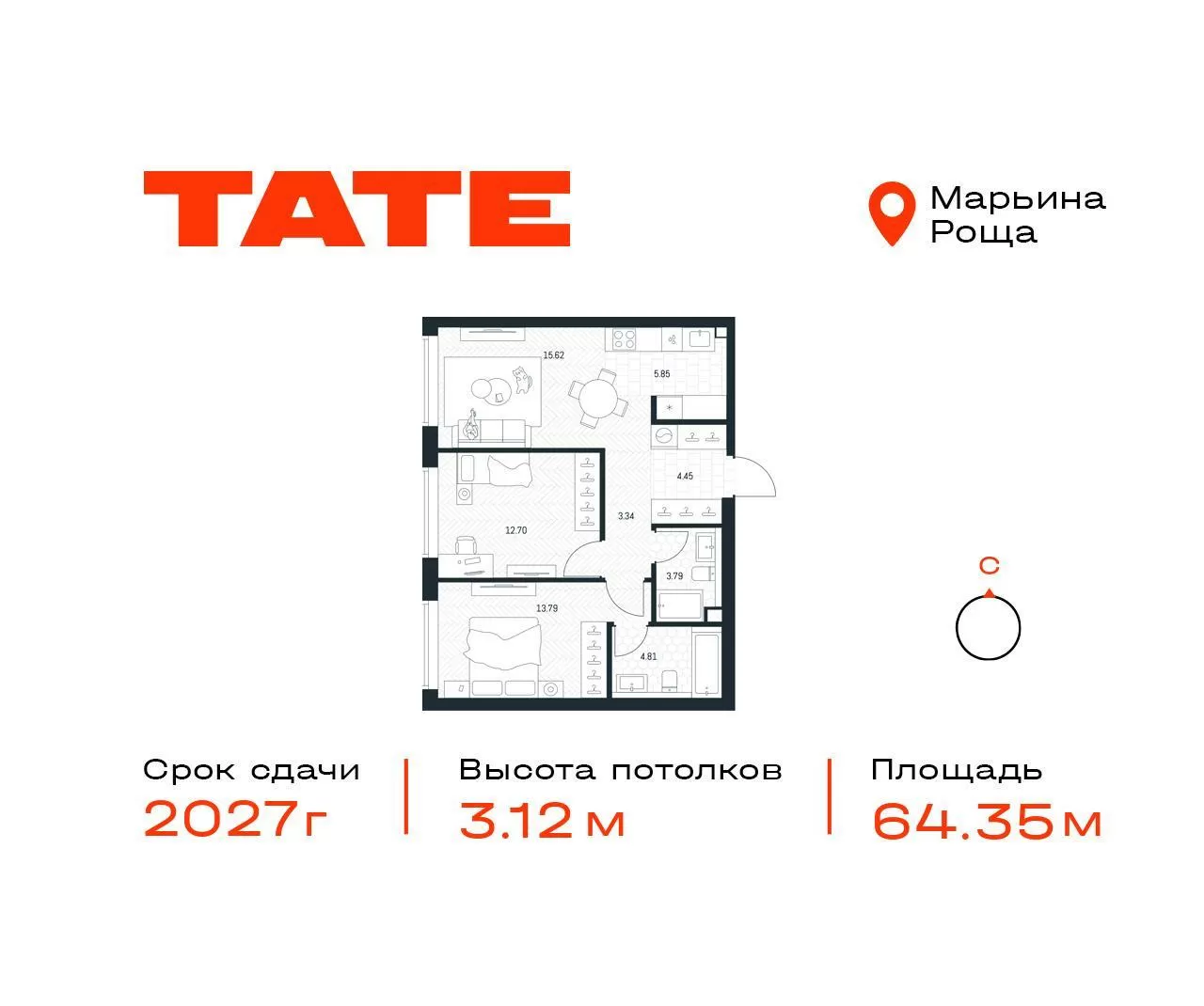64.34 м² · 2 комнаты · 17/49 этаж · Июнь 2027