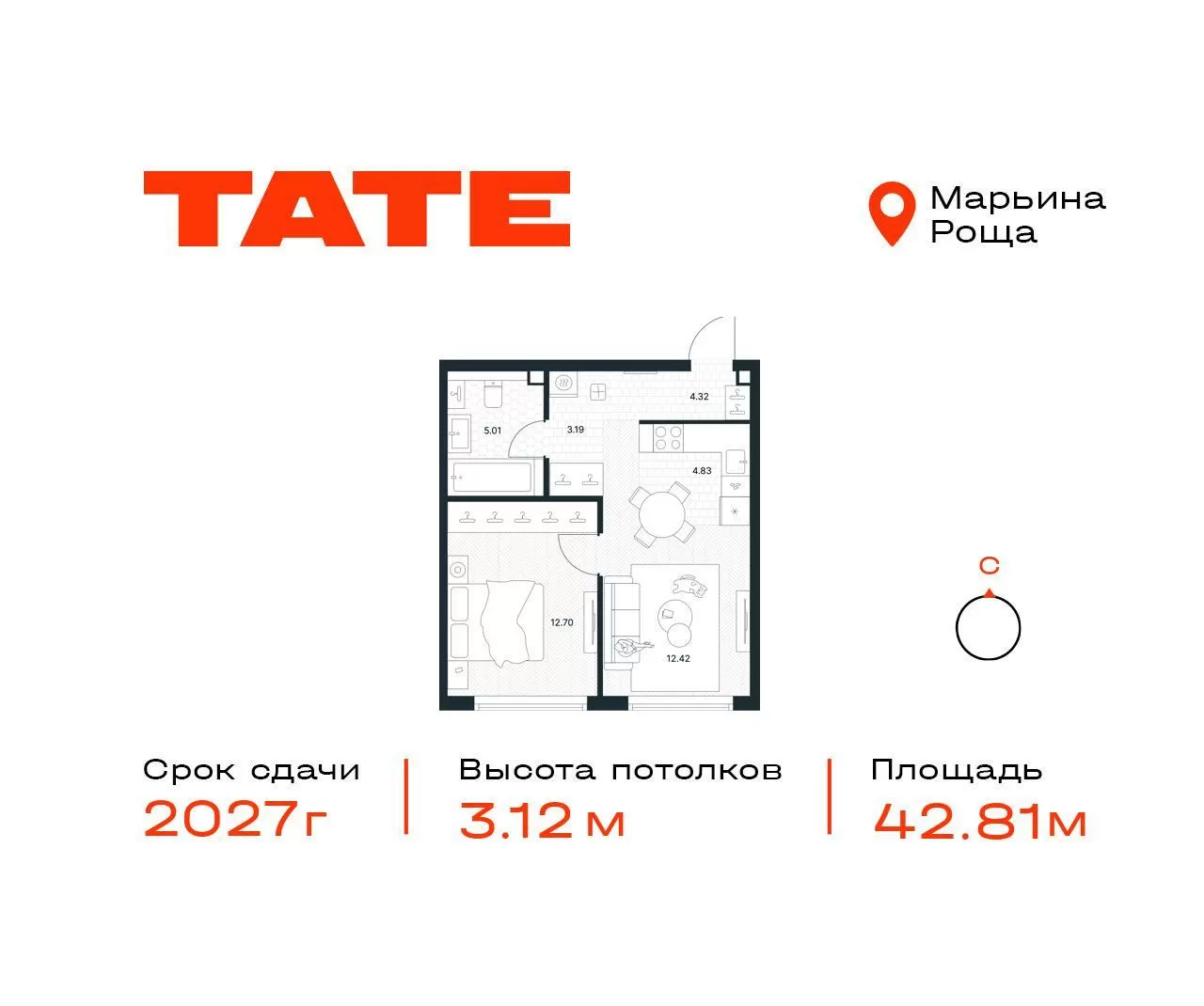 42.48 м² · 1 комната · 18/49 этаж · Июнь 2027