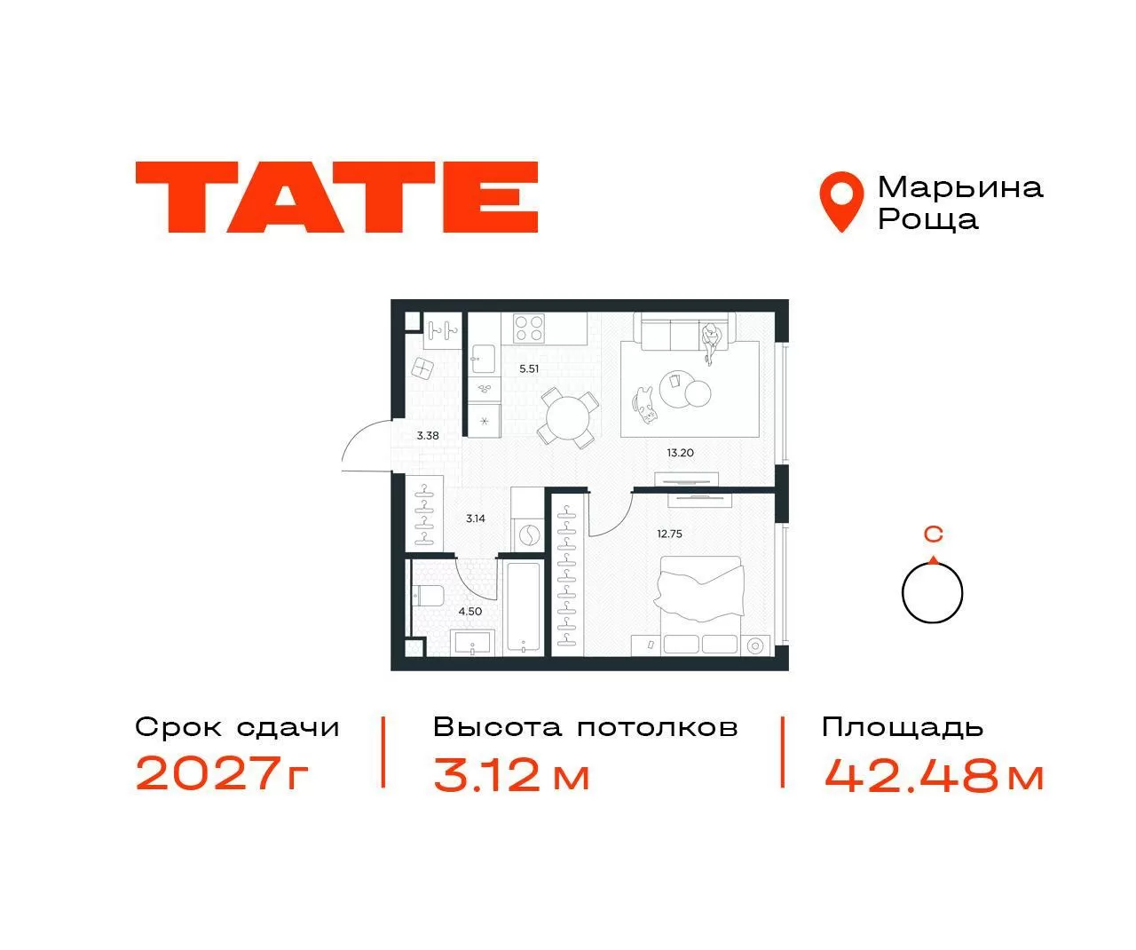 42.48 м² · 1 комната · 18/49 этаж · Июнь 2027