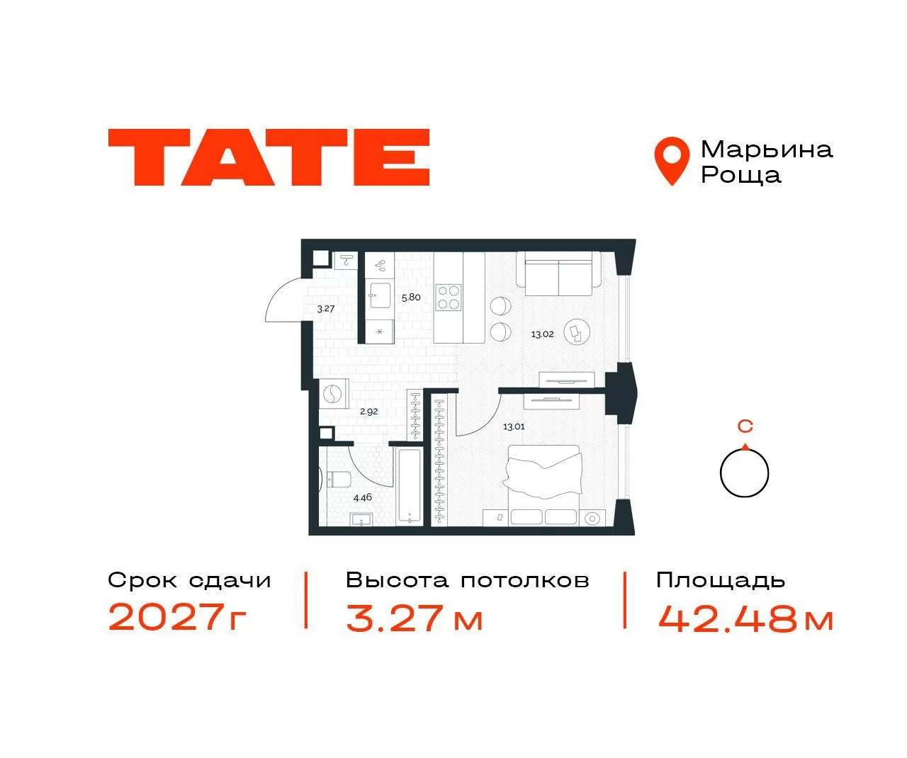 Продажа 1-комнатной квартиры № 6, 42.48 кв.м, этаж 27/49 в ЖК Тейт (TATE)