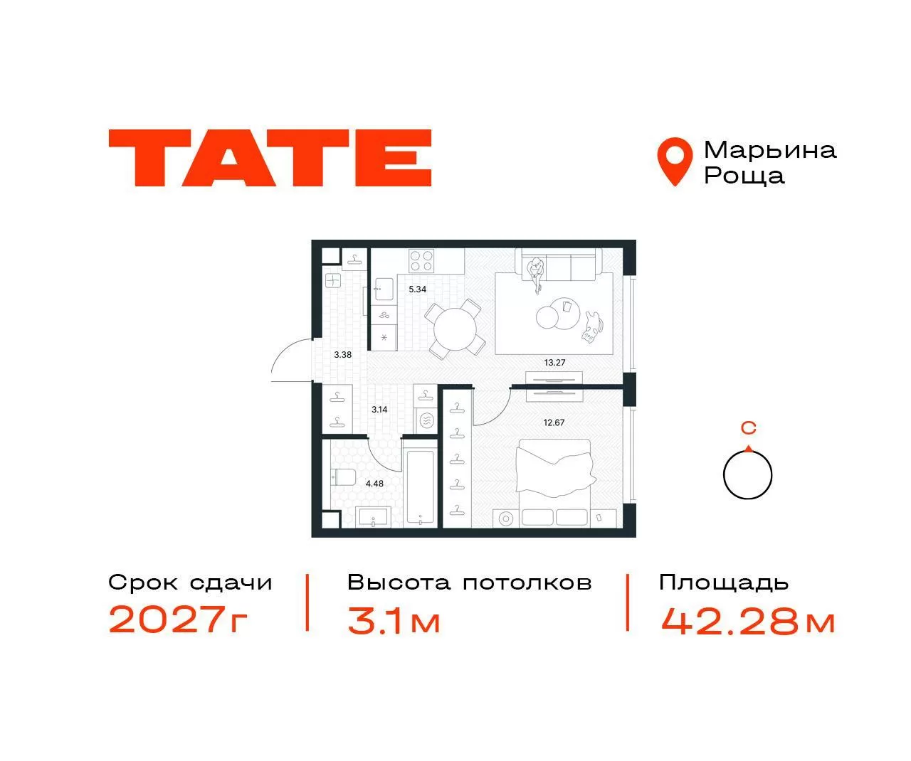 Продажа 1-комнатной квартиры № 6, 42.28 кв.м, этаж 35/49 в ЖК Тейт (TATE)