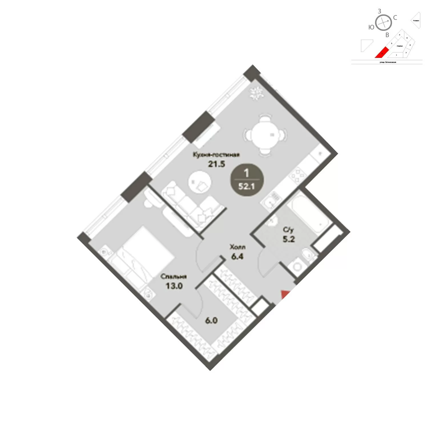 Продажа 1-комнатной квартиры № 7, 52.3 кв.м, этаж 2/10 в ЖК Voxhall (Воксхолл)