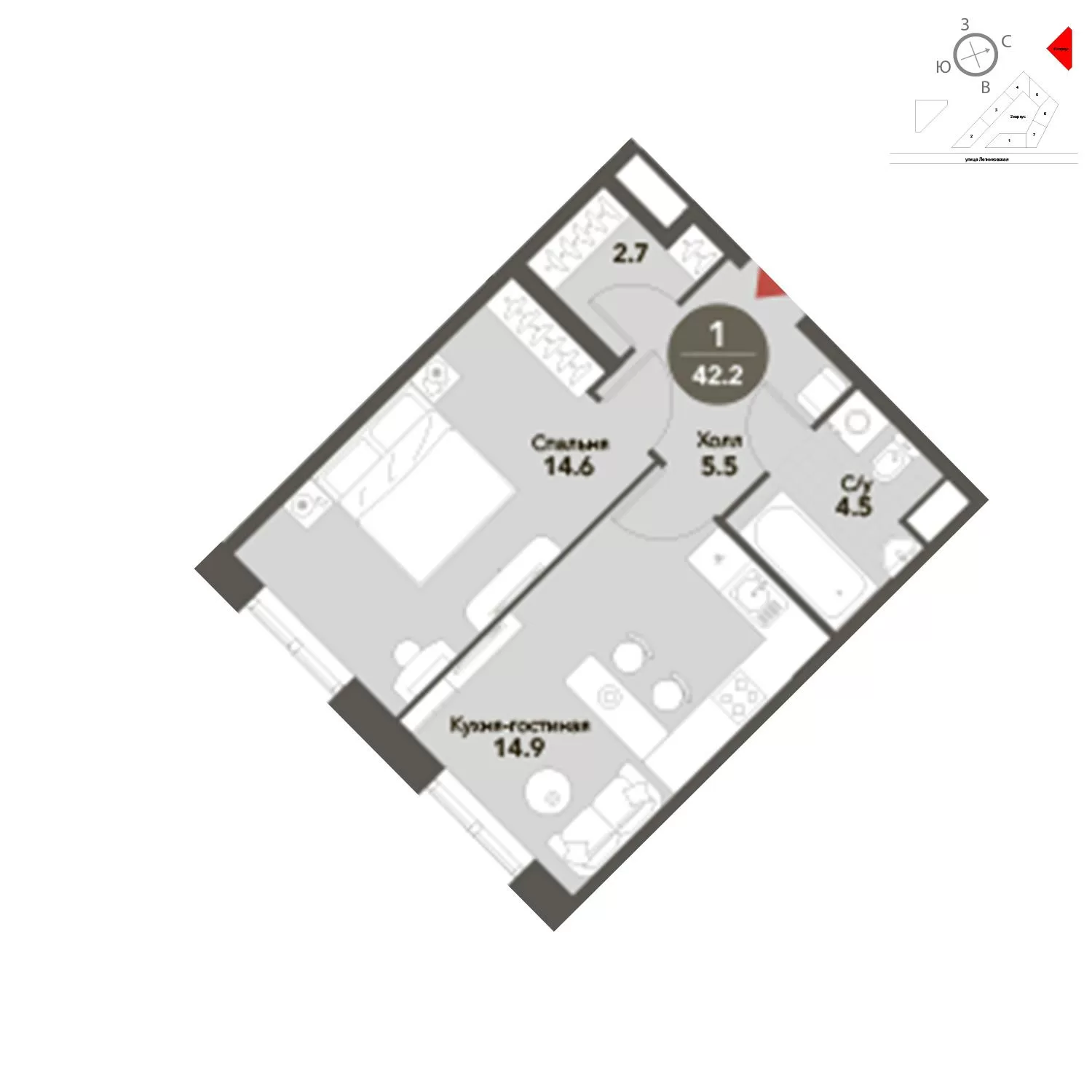 Продажа 1-комнатной квартиры-апартамента № 3, 42.2 кв.м, этаж 13/19 в ЖК Voxhall (Воксхолл)