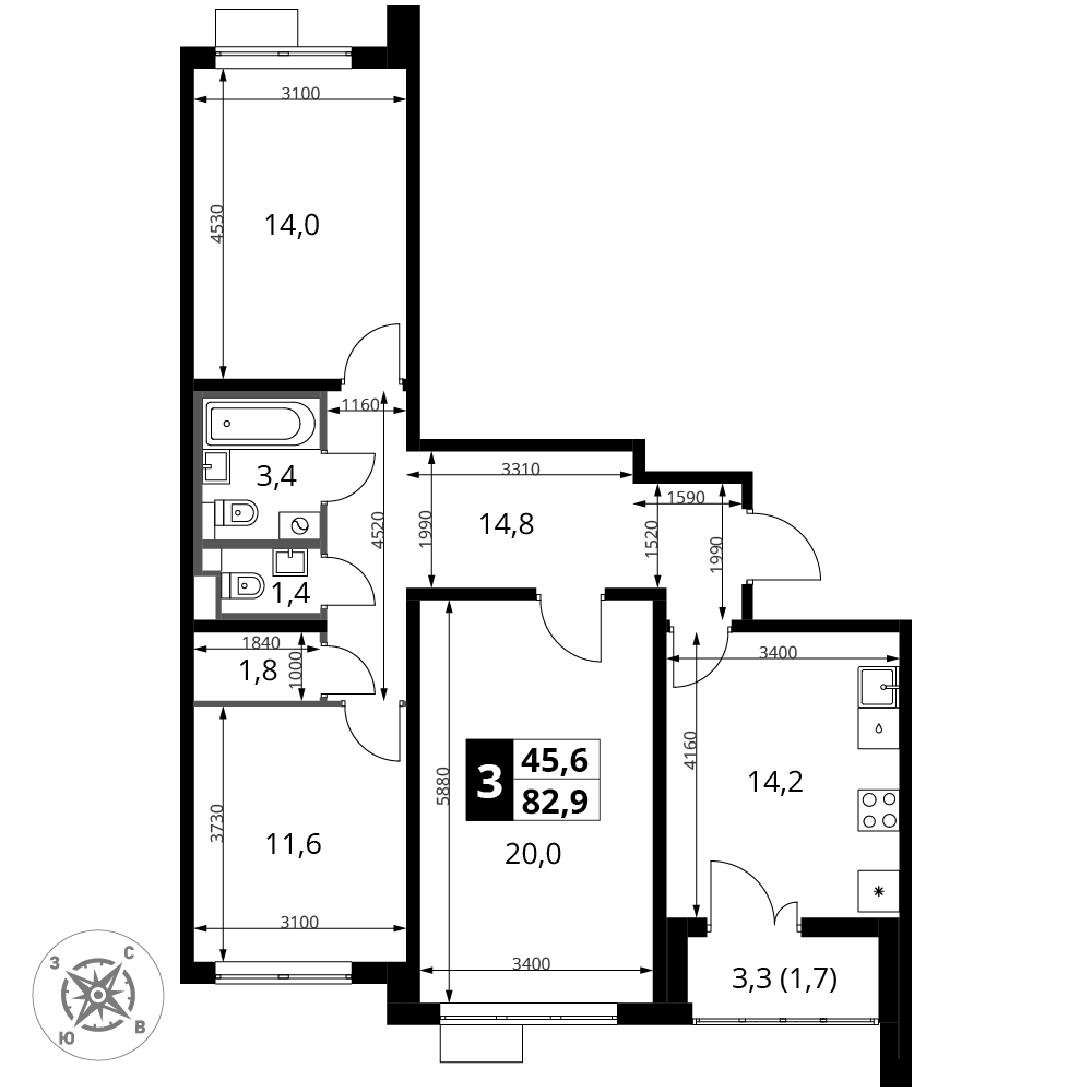 ГлавнаяЖилая недвижимостьЖК «Южная Битца»3-комнатная квартира № 1