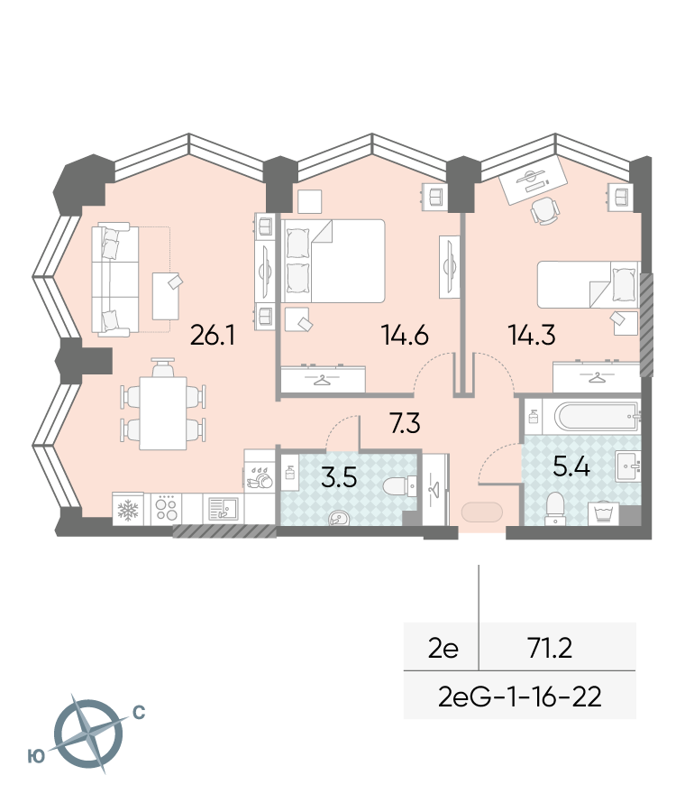 59.8 м² · 2 комнаты · 26/43 этаж · Декабрь 2027