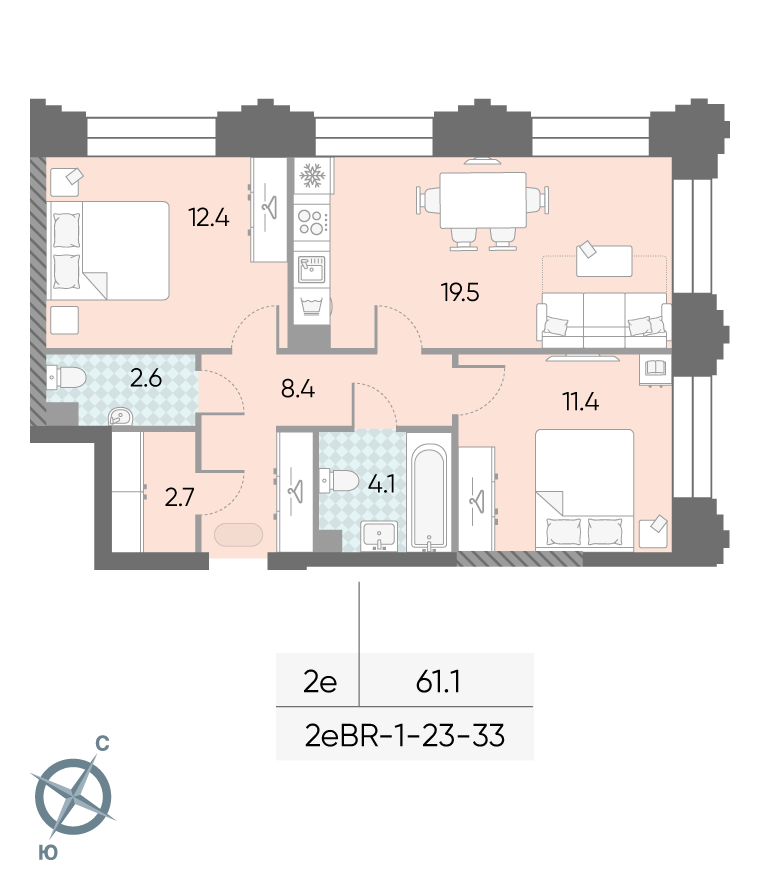 59.8 м² · 2 комнаты · 30/43 этаж · Декабрь 2027