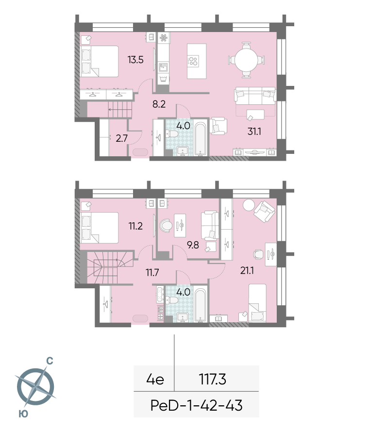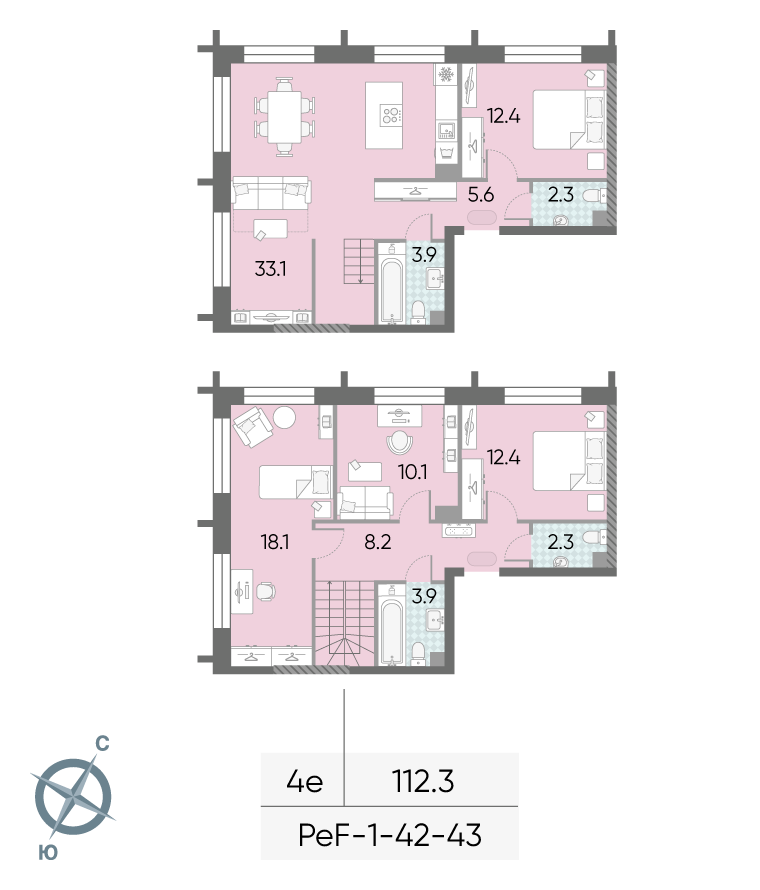 112.3 м² · 4 комнаты · 42/43 этаж · Декабрь 2027