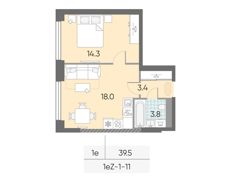 39.6 м² · 1 комната · 8/43 этаж · Декабрь 2027