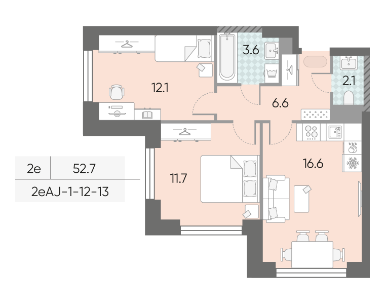 52.7 м² · 2 комнаты · 13/43 этаж · Декабрь 2027