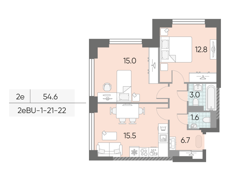 52.7 м² · 2 комнаты · 15/43 этаж · Декабрь 2027