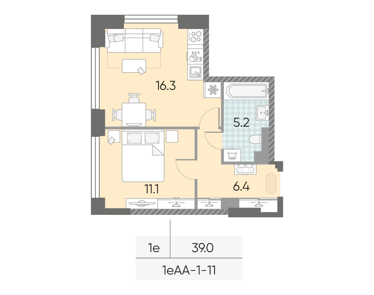 38.9 м² · 1 комната · 6/43 этаж · Декабрь 2027