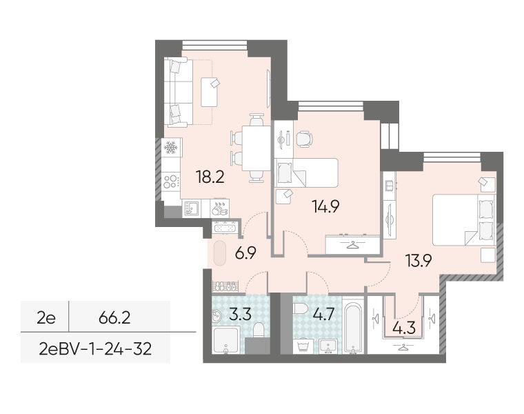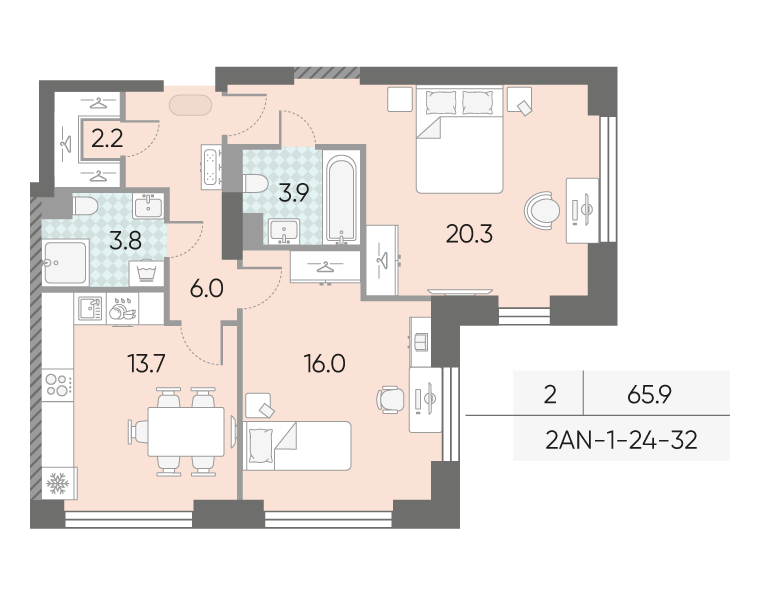 66.2 м² · 2 комнаты · 20/43 этаж · Декабрь 2027