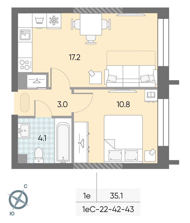 18.9 м² · 1 комната · 42/43 этаж · Декабрь 2027