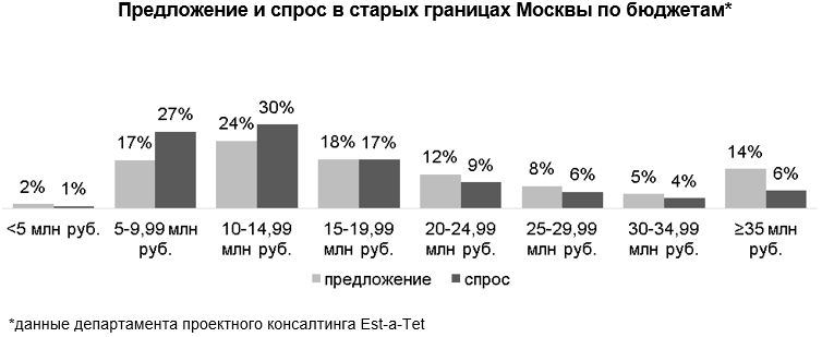 По данным Est-a-Tet на начало мая в бюджете 30 млн рублей в старых границах Москвы доступно 81% предложения квартир. Оставшиеся 19% — это дорогие лоты либо в элитных, премиальных объектах, либо это штучные объекты бизнес-класса, например, пентхаусы или многокомнатные квартиры. При расчетах учитывалась только стоимость объекта, без учета первоначального взноса.